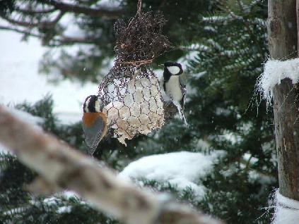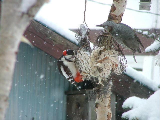 脂身大好きのアカゲラを横目にみつめるヒヨドリ
