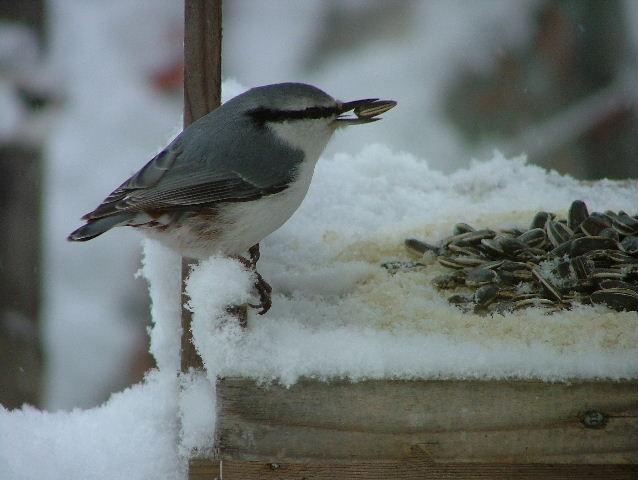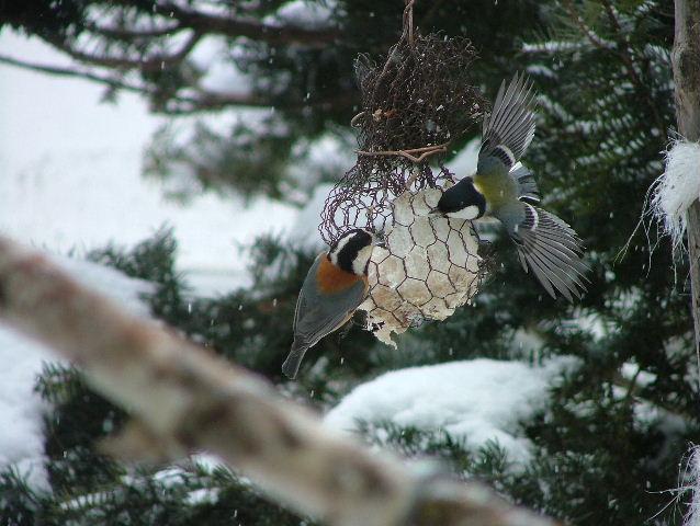 シジュウカラはひまわりの種をくわえて足で押さえてクチバシで割って上手にたべますが、ゴジュウカラはくわえて行った種をすきまとか割れ目に差し込んだりして固定してからクチバシで種を割ります。