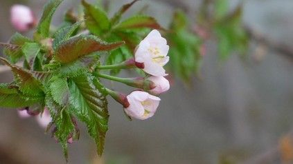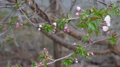 我家の千島桜、開花進まず・・。夕方近くやっと4輪開花しました。しぶとかったですね。原因には雨が少なかったこともあるようです。