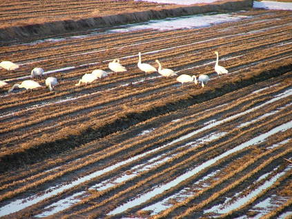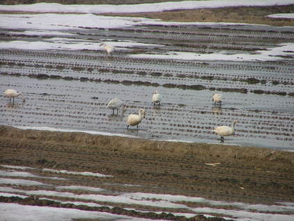 もう耕せる田んぼも見受けられます。で、白鳥も水のある田んぼを探して採餌していますが、今年は降り立つ場所がなくて、あまり深川では見られないで北にかえっちゃうみたいです。やっと見つけました。
