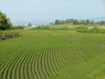 地形に畝筋を合わせて植えるとこんなきれいな流れになります。