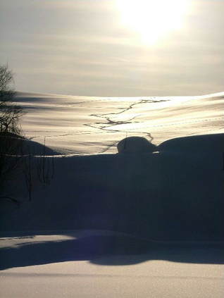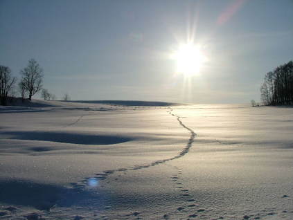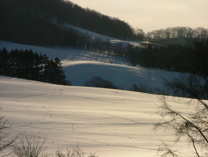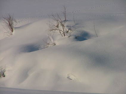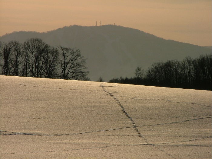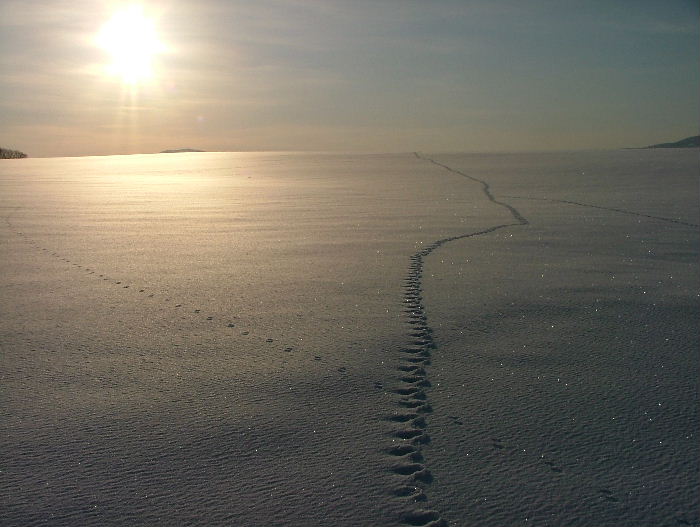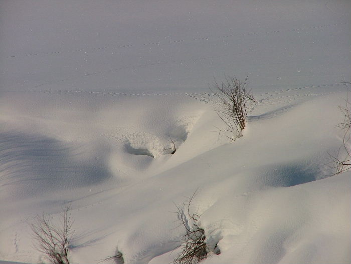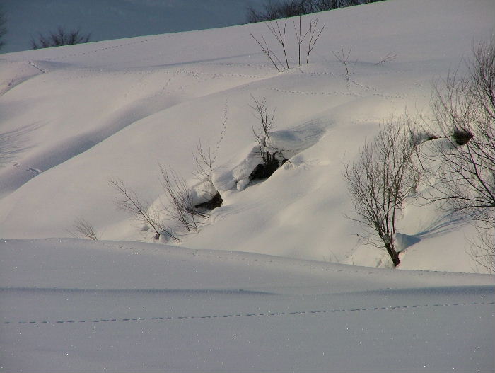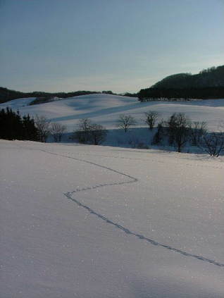 いやぁ~、やっと暖かい朝でした。 融けていますから・・。 除雪車が何回か通って腐った雪を脇に出してくれました。 昨日は道はぐちゃぐちゃでわき道に入ると雪が腐っていてハンドルが取られ車が右に左に・・・。春だなぁ~・・・・と言う気分です。 でも、春はまだまだなんですよね。 まだ2月ですから降りますし、3月にもドカ雪は来ます。 これからの時期雪が融けて、朝に冷えると堅雪になってどこでも歩けるようになります。楽しみです。 雪の上の足跡は想像力をかきたてます。あっちをうろうろこっちをうろうろ・・。 動物たちの動きが分かって楽しいです。 きっと、餌を探しているんでしょうね。 私の足跡はこのブログかな?