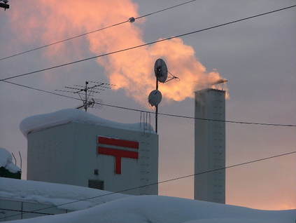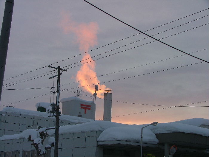 郵便局の煙突から出ている煙に朝日が当たってきれいでしたね。 通りがかりの朝の風景でした。
