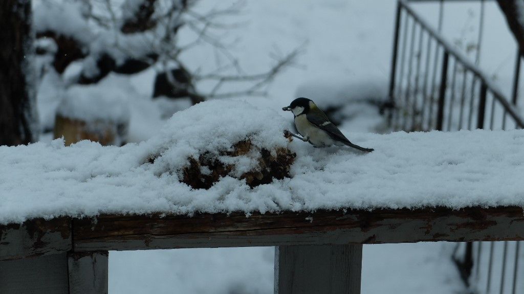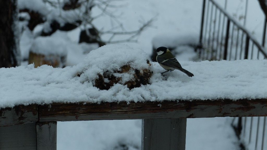 貰ってきたひまわりを置いておいたけど雪が降り積もってシジュウカラも困っていたので雪をはねてあげました。早速やってきました。