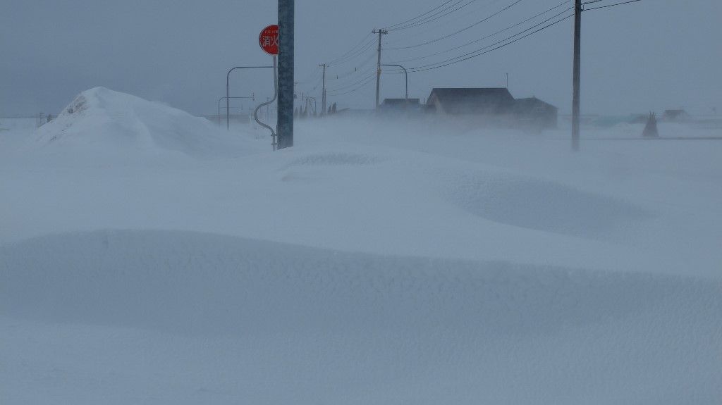 台風級の低気圧の影響が深川にもやってきました。他の地域の天候は人ごとのように聞いて居ましたが今日は実感しました。吹きさらしの道路は大きな吹きだまりが出来ていました。