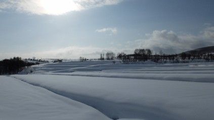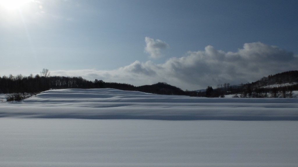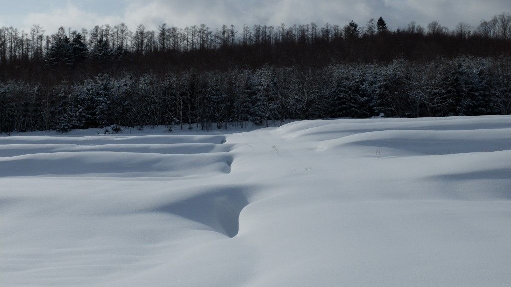 雨の後に降った雪が枝に付いたものの西風で飛ばされた斜面と影響を受けなかった斜面とはっきりわかる素敵な日曜日でした。