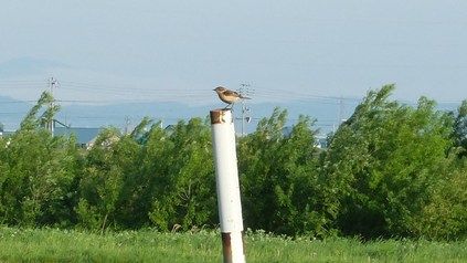 オオヨシキリの鳴き声が盛んに聞こえる中、遠くでかっこうが鳴いてます。こちらはノビタキ夫婦が採餌中。オスが何かを咥えて飛び去りました。近くにはメスが見守っていました。