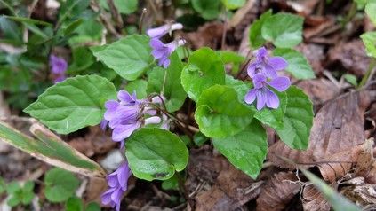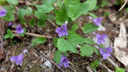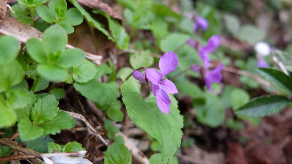 山道に咲く濃い色のスミレ。