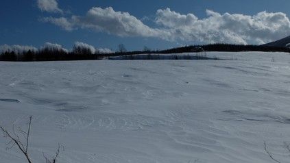 昨日の猛吹雪はなんだったんでしょうね。死ぬ思いで突き抜けたところが何カ所があって恐怖感で一杯でした。 昔の道路事情を思い出しています。田舎育ちの身ですから今の様に道路は除雪されていません。馬や人が通った後は踏み固められて回りより高くなって降った雪も吹雪で飛ばされて道路だけが残ります。吹雪は地面を吹き抜けるので固い道を踏み外さなければ目をつぶってでも歩けました。 今の時代は道路が脇の雪の高さより低いので雪が吹き込み、目線に雪が舞うと全く見えなくなります。 恐ろしい吹雪の後も何事もなかったかのように模様を描いて輝いています。