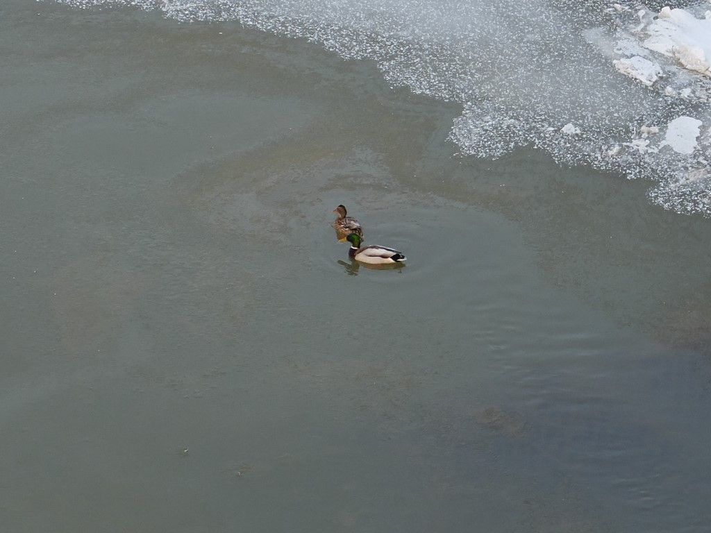 こんな寒い水面でもカモが仲良く泳いでいました。