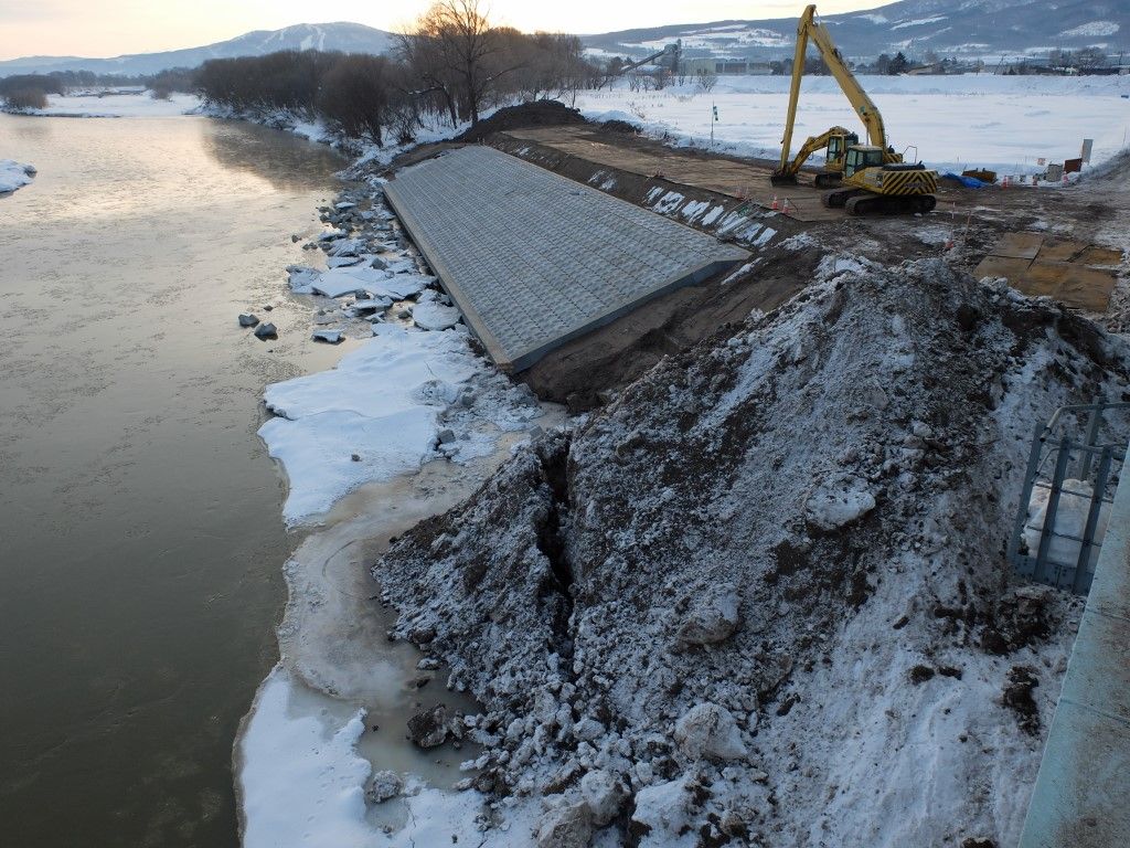 護岸工事が進んでいます。結構な数のコンクリート板が張り付いていますね。