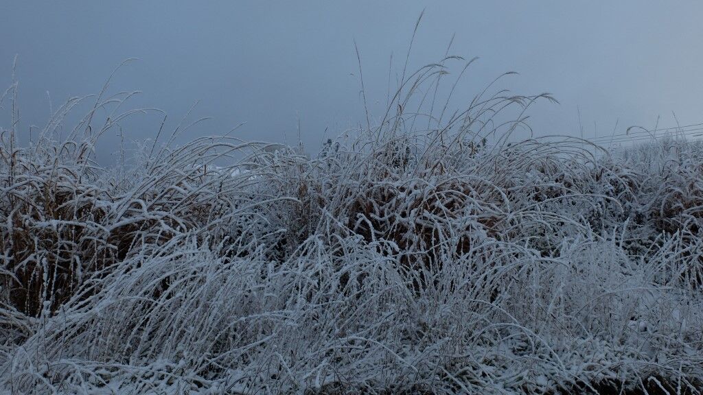 背景は鉛色で・・・風がないので草にも雪が乗っかって