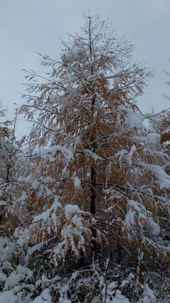 落葉松がまだ葉を落とし切れていません