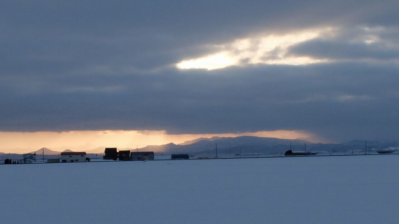 背景が雪雲の夕景